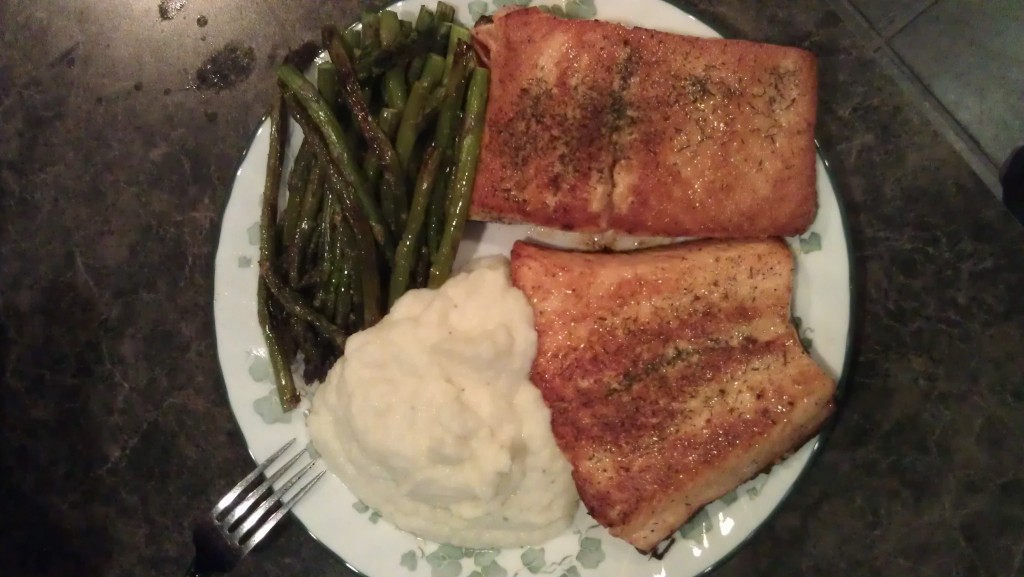 We made the most amazing dinner. Pan cooked Salmon, oven roasted asparagus and mashed cauliflower with sour cream. Amazing!