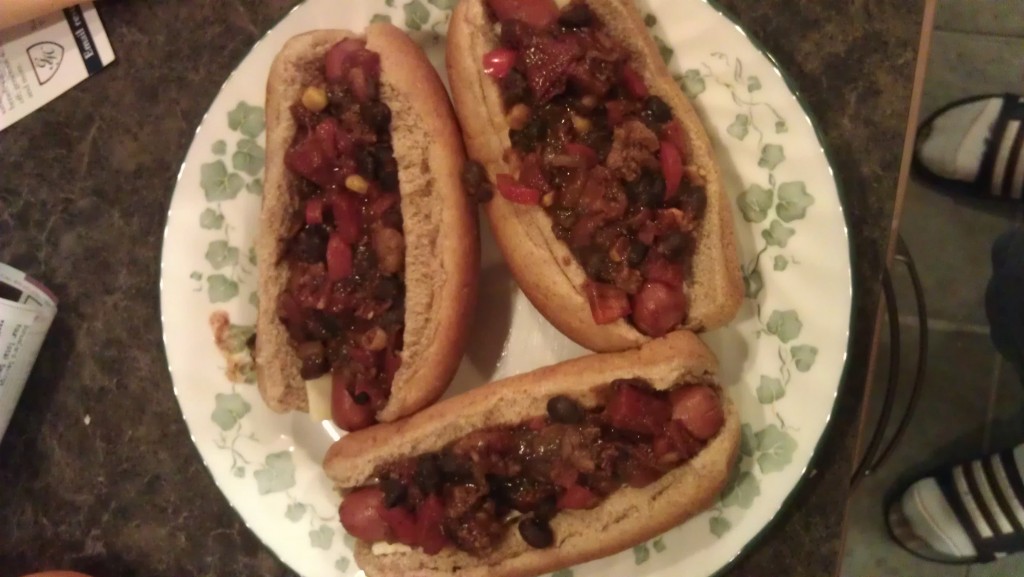 Today was a great day for eating but a poor day for nutrition. Dinner was not totally evil but it was not my normal better balanced meals either. I made a veggie chili and added the left over ground turkey taco meat and cooked some Hebrew National reduced fat beef hotdogs. I had 3 with buns and that was a lot of carbs for one meal plus I was carb heavy for the day already. Tomorrow I will suffer! Here is what my “dinner of gas production” or “dinner of diet destruction” looked like.