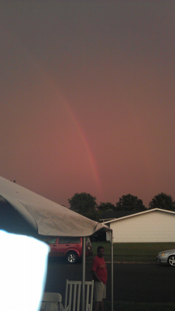 I was teasing my mom with wet willies and she got me back pretty good. As I was standing near her she got me with a cup of water, you can see the proof in the picture above. As the day slipped away and evening settled in a storm tore throught the area. Some towms lost power but luckily we were OK. The tent almost took off with a wind gust and I quickly was able to grab it and keep it grounded. Cars were moved and the tent left to the will of the wind and it managed to stay put. After the storm passed we say a rainbow in the sky with a second one forming next to it.
