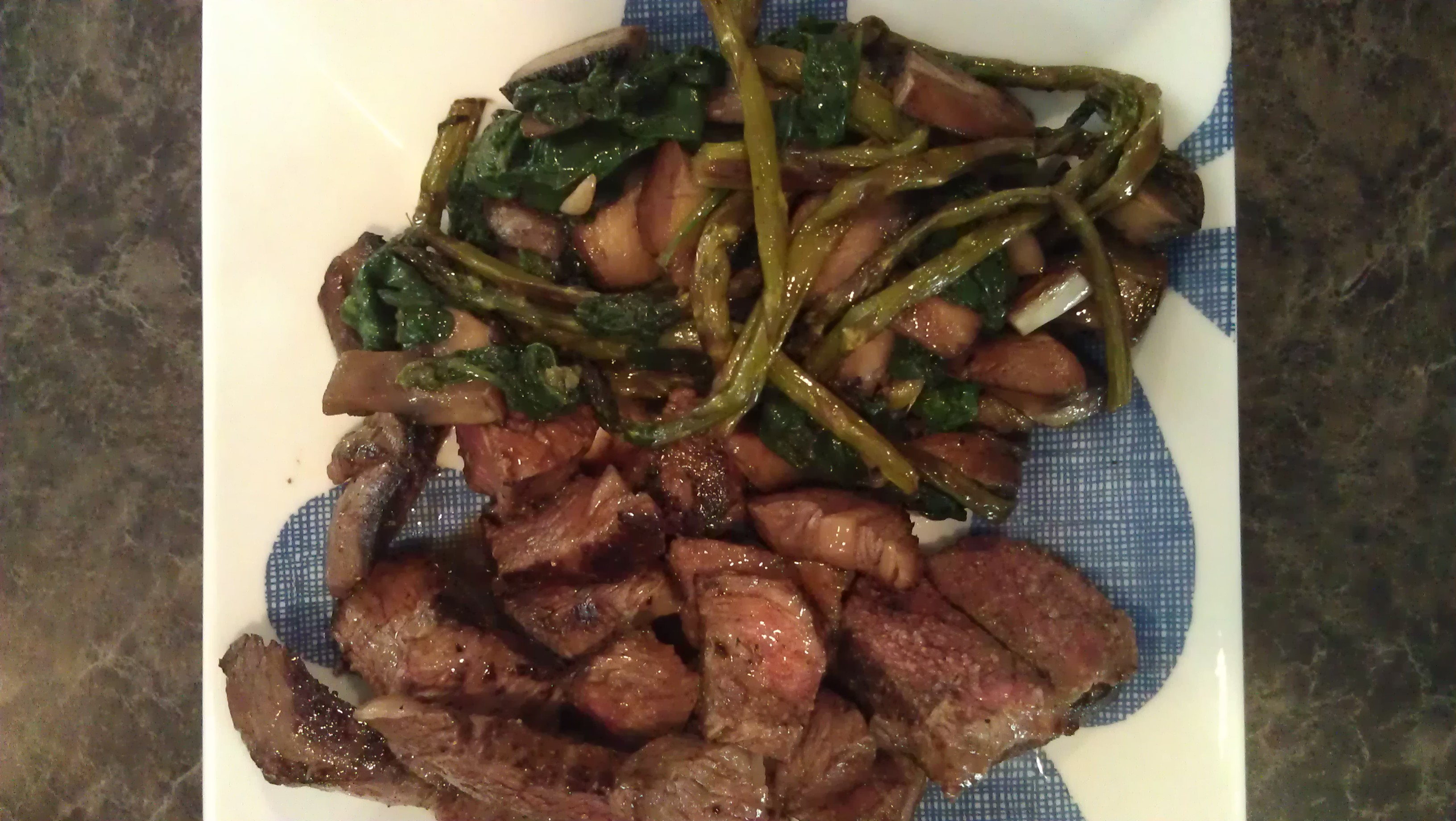 My nutrition was good for the day, I consumed 2,278 calories. Of course dinner was the best! Steak with asparagus and also portobello mushrooms, garlic cloves and baby spinach.